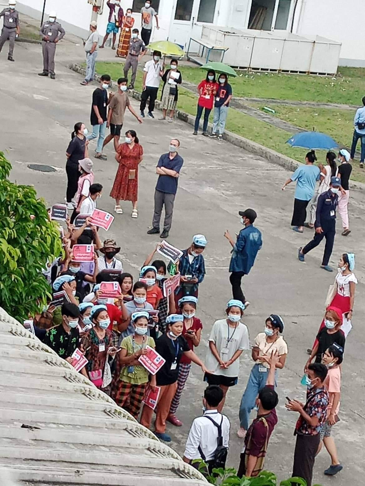 ရန်ကုန်တိုင်းဒေသကြီးရွှေပြည်သာမြို့နယ် မှာရှိတဲ့ မြန်မာပေါင်ချိန်ဖိနပ်စက်ရုံမှ စက်ရုံလုပ်သားတွေဟာ ကုန်ဈေးနှုန်းမြင့်တက်လာမှုတာကြောင့် တစ်နေ့လုပ်ခအနည်းဆုံးအခကြေးငွေကို သင့်တင့်မျှတတဲ့လစာအဖြစ် တိုးပေးရန်ညှိနှိုင်းမှုလက်မခံတာကြောင့် စက်ရုံလုပ်သားအားလုံးစုပေါင်းဆန္ဒပြခဲ့တယ်လို့ သိရပါတယ်။